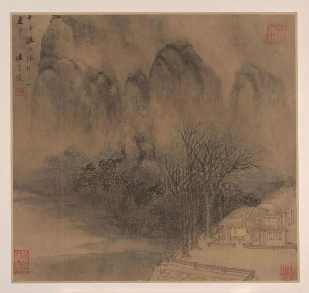 第四开:画面题诗为韩翃的《华亭夜宴庾侍御宅》中的“千峰孤竹外,片雨一更中”。图中巨山如嶂,风急雨骤。山下草木飘摇,随风而动。茅屋中有人依门而立,似乎等候羁旅之人;有人静坐陋室,烛照千山。