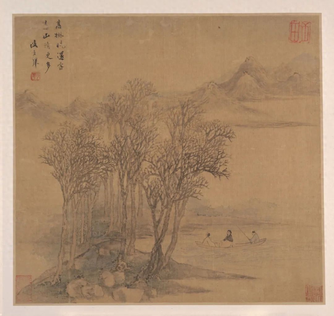 第一开:画面题诗为唐代诗人许浑的《早秋三首·其一》中的“高树晓还密,远山晴更多”。图中遥山清淡,晓岚浮动,广漠的原野上一丛高树突兀而立,枝桠交接,密不透风。树下芳草乍露,春水荡漾,小船上两人相对而谈,一人独钓清波,甚是惬意。