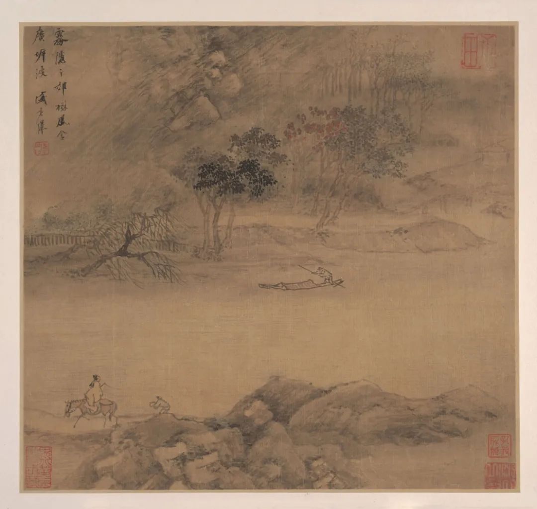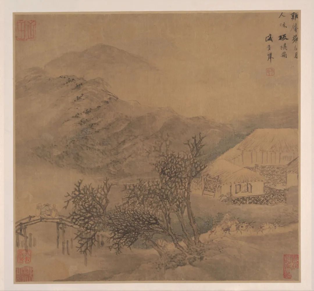 第五开:画面题诗为温庭筠的《商山早行》中的“鸡声茅店月,人迹板桥霜”。图中山川迢递,草木萧疏。晨光微露,寒意袭人。一声鸡鸣叫醒了茅店中的旅居之人,道路上行人络绎不绝,开始了一天的忙碌。