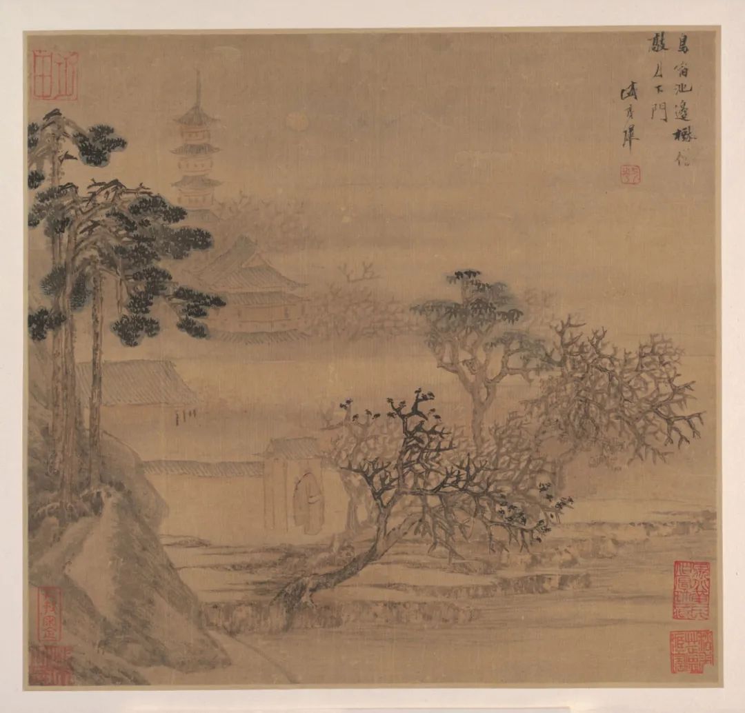 《唐诗意山水图册》。形式:册页,绢本,设色。尺寸:每开尺寸微有不同,例如大都会艺术博物馆所藏的版本,尺寸约为28.6厘米×30.5厘米。内容:共有山水画六开,每开均配以唐诗一首,描绘不同风景。