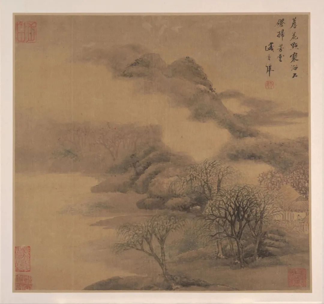 第二开:画面题诗为权德舆的《与沈十九拾遗同游栖霞寺上方于亮上人院会宿二首》中的“岩花点寒溜,石磴扫春云”。图中青寒料峭,云山飘渺,山岩间新绿渐吐,花色迷离。坡石磊磊,春水微泛,柳发新条,摇曳生姿。矮墙后面的茅屋中,有一位高士正在静坐观山。